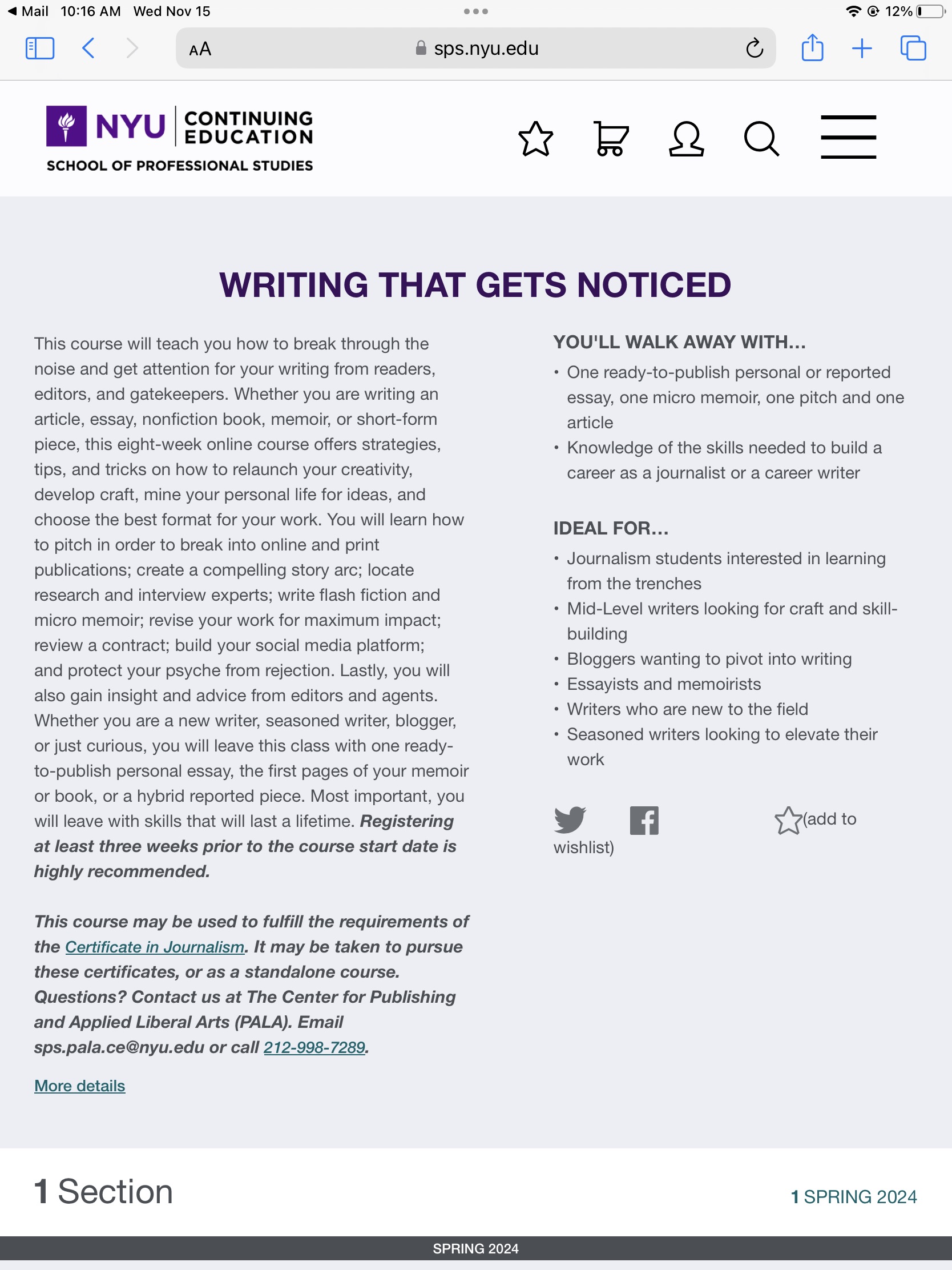 NYU's School of Professional Studies (NYUSPSPALA) has made Writing That Gets Noticed, a course part of the journalism certificate curriculum. See it here.